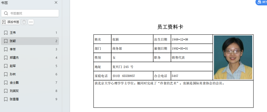 生成的文档如下,左边有个书签,用于选择员工: