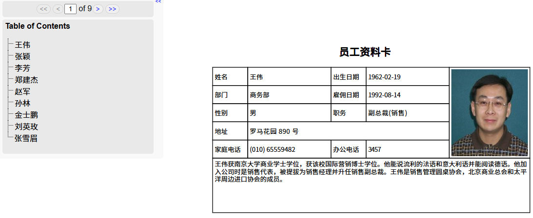 生成的文档如下,左边除了导航栏,还有个大纲(书签)树,用于选择员工: