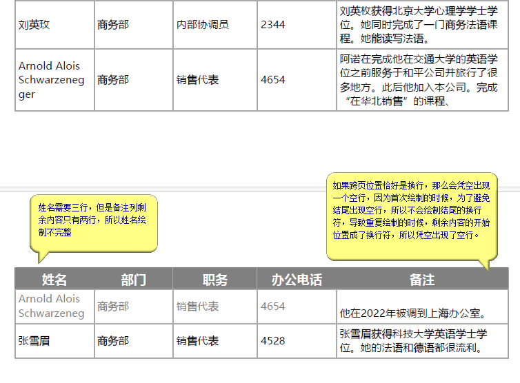 2、如果跨页之后,剩余内容的长度小于其他列,那么其他列可能无法在重复行完整绘制出。